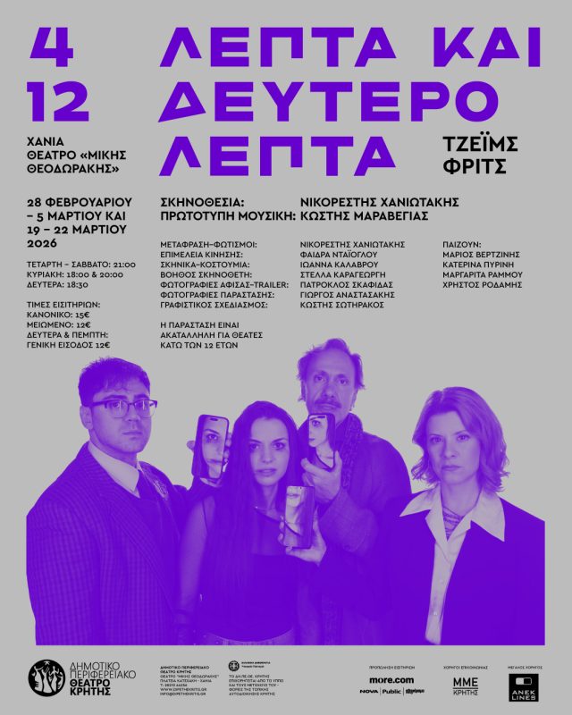 Πώς ένα βίντεο διάρκειας τεσσάρων λεπτών και δώδεκα δευτερολέπτων μπορεί να αλλάξει την ζωή δύο οικογενειών; Η μεγάλη επιτυχία του Λονδίνου «4 minutes 12 seconds» του James Fritz που απέσπασε το 2ο βραβείο «Verity Bargate» στο διαγωνισμό για το καλύτερο νέο αγγλικό έργο παρουσιάζεται από το ΔΗ.ΠΕ.ΘΕ. Κρήτης σε μια παράσταση δυνατών συγκινήσεων.