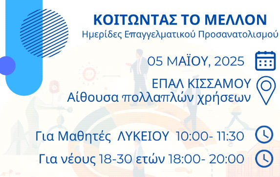Το πρωί της Δευτέρας 5 Μαΐου, 10:00-11:30 οι μαθητές του ΕΠΑΛ Κισάμου θα πληροφορηθούν για την επιλογή σπουδών και τις επαγγελματικές προοπτικές από τον κ. Σαμψωνίδη .
