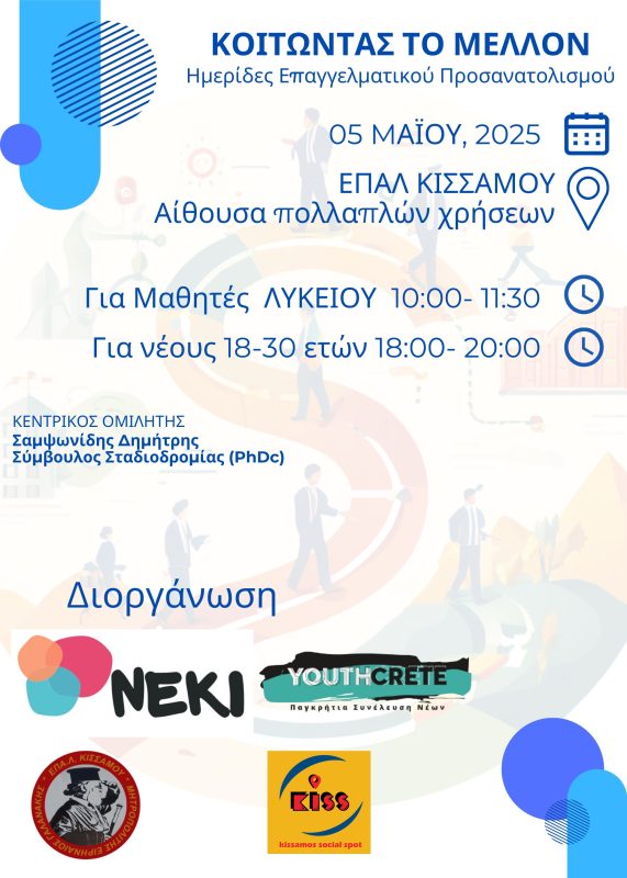 H Νεολαία Κισάμου, σε συνεργασία με τον εθελοντικό σύλλογο «Σημείο Κοινωνικών Δράσεων Κισάμου»Kissamos Social Spot, διοργανώνει μεγάλη ημερίδα Επαγγελματικού Προσανατολισμού με θέμα: “Κοιτάζοντας το μέλλον”, σε συνεργασία με το Youth Crete.