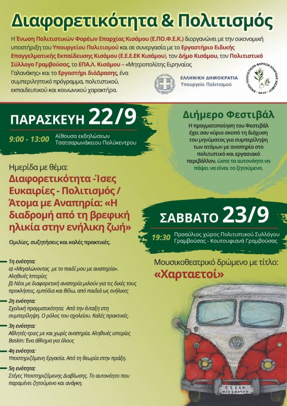Η Ε.ΠΟ.Φ.Ε.Κ. διοργανώνει με την οικονομική υποστήριξη του Υπουργείου Πολιτισμού και σε συνεργασία με το Εργαστήριο Ειδικής Επαγγελματικής Εκπαίδευσης Κισάμου (Ε.Ε.Ε.ΕΚ Κισάμου), τον Δήμο Κισάμου, τον Πολιτιστικό Σύλλογο Γραμβούσας, το ΕΠΑ.Λ. Κισάμου – «Μητροπολίτης Ειρηναίος Γαλανάκης» και το Εργαστήρι διάΔρασης ένα συμπεριληπτικό πρόγραμμα, πολιτιστικού, εκπαιδευτικού και κοινωνικού χαρακτήρα με τίτλο: «Διαφορετικότητα & Πολιτισμός».