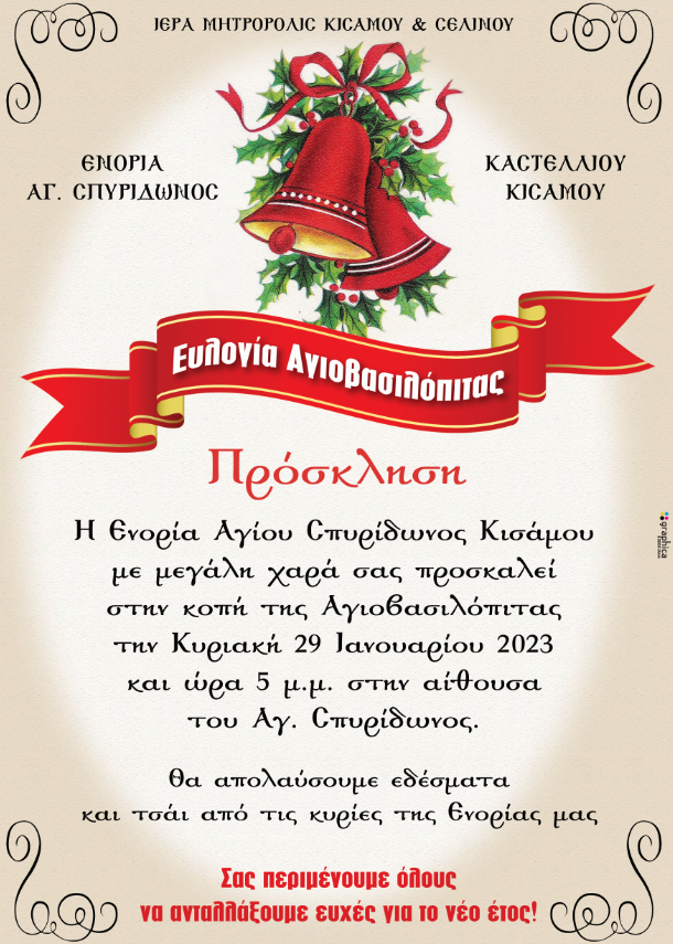 Δήμος Κισάμου Kίσαμος: Κοπή της Αγιοβασιλόπιτας στην Ενορία Αγίου Σπυρίδωνος 26 Ιανουαρίου 2023 23:14 Μοιραστείτε αυτό! Facebook Twitter Google Plus Pinterest LinkedIn Η Ενορία Αγίου Σπυρίδωνος Καστελλίου, σας προσκαλεί στην κοπή της Αγιοβασιλόπιτας την Κυριακή 29 Ιανουαρίου και ώρα 5 μ.μ. στην αίθουσα του Αγίου Σπυρίδωνος, Θα απολαύσουμε εδέσματα και τσάι από τις κυρίες της Ενορίας μας. μπορεί να σου αρέσει επίσης Γεύση - Ψυχαγωγία Ομαθιές: Το Κρητικό γιορτινό φαγητό που στο Βυζάντιο όποιος το έφτιαχνε τιμωρούνταν και διαπομπεύονταν 17 Δεκεμβρίου 2025 ΚΡΗΤΗ Ουρανία Ξυλούρη: “Έζησα μόνο 20 χρόνια μαζί του και μου λείπει 45” 17 Δεκεμβρίου 2025 ΚΡΗΤΗ • ΝΕΟΙ ΟΡΙΖΟΝΤΕΣ • ΤΟΥΡΙΣΜΟΣ Κρήτη: Χιλιάδες οι κενές θέσεις στα ξενοδοχεία και το 2026 – Αρχίζει το «κυνήγι» του προσωπικού 17 Δεκεμβρίου 2025 Εξελέγη το νέο Δ.Σ. του Νέου Κισαμικού Ρετζακας Trail Run 2023: Το επίσημο πρόγραμμα της φετινής διοργάνωσης Μοιραστείτε αυτό! Facebook Twitter Google Plus Pinterest LinkedIn ΡΟΗ ΕΙΔΗΣΕΩΝ Γεύση - Ψυχαγωγία Ομαθιές: Το Κρητικό γιορτινό φαγητό που στο Βυζάντιο όποιος το έφτιαχνε τιμωρούνταν και διαπομπεύονταν 17 Δεκεμβρίου 2025 19:43 ΚΡΗΤΗ Ουρανία Ξυλούρη: “Έζησα μόνο 20 χρόνια μαζί του και μου λείπει 45” 17 Δεκεμβρίου 2025 19:37 ΚΡΗΤΗ • ΝΕΟΙ ΟΡΙΖΟΝΤΕΣ • ΤΟΥΡΙΣΜΟΣ Κρήτη: Χιλιάδες οι κενές θέσεις στα ξενοδοχεία και το 2026 – Αρχίζει το «κυνήγι» του προσωπικού 17 Δεκεμβρίου 2025 19:31 ΚΡΗΤΗ Κρήτη: Ο καιρός αύριο Πέμπτη 18 Δεκεμβρίου 17 Δεκεμβρίου 2025 19:10 Γεύση - Ψυχαγωγία • Νομός Χανίων Χανιά – Santa Gang: Η «συμμορία» του Αϊ – Βασίλη! επιστρέφει την Κυριακή στο Ενετικό Λιμάνι 17 Δεκεμβρίου 2025 18:59 Νομός Χανίων • ΠΑΙΔΕΙΑ - ΕΚΠΑΙΔΕΥΣΗ Χανιά: Γιορτινές χριστουγεννιάτικες δράσεις για παιδιά στις Παιδικές – Εφηβικές Βιβλιοθήκες, τα ΚΠΔ/ΚΔΑΠ του Δήμου 17 Δεκεμβρίου 2025 18:54 ΑΓΡΟΤΙΚΑ • ΝΕΟΙ ΟΡΙΖΟΝΤΕΣ Αποκαταστάθηκαν οι πληρωμές στους αγρότες μετά το τεχνικό πρόβλημα – Κανονικά οι καταβολές ενισχύσεων 17 Δεκεμβρίου 2025 16:16 Γεύση - Ψυχαγωγία • ΕΝΔΙΑΦΕΡΟΝΤΑ Ο λόγος που δεν πρέπει να αποθηκεύσουμε το ελαιόλαδο σε τενεκέ 17 Δεκεμβρίου 2025 15:16 Νομός Χανίων Χανιά – Εξαφάνιση 33χρονου γιατρού: Προσήχθη στην Ασφάλεια ο ερευνητής που ισχυριζόταν ότι ξέρει που βρίσκεται – Κανένα ίχνος του νεαρού Αλέξη μέχρι στιγμής 17 Δεκεμβρίου 2025 13:29 ΚΡΗΤΗ Κρήτη: Τιμή στο Πυροσβεστικό Σώμα – Δοξολογία στον Άγιο Μηνά και επίδειξη σωστικών μέσων (φωτογραφίες, βίντεο) 17 Δεκεμβρίου 2025 13:19 ΕΝΔΙΑΦΕΡΟΝΤΑ Τετάρτη: Η ιδανική μέρα για να υιοθετήσετε νέες συνήθειες! 17 Δεκεμβρίου 2025 12:57 Γεύση - Ψυχαγωγία Tα πιο γιορτινά νύχια που θα εντυπωσιάσουν τους πάντες στα Χριστουγεννιάτικα πάρτι! 17 Δεκεμβρίου 2025 12:43 ΑΓΡΟΤΙΚΑ • ΚΡΗΤΗ Κρήτη: Σήμερα το βράδυ η συνεδρίαση της Παγκρήτιας Συντονιστικής Επιτροπής των αγροτών 17 Δεκεμβρίου 2025 12:20 ΕΛΛΑΔΑ • ΚΡΗΤΗ Σκάνδαλο ΟΠΕΚΕΠΕ: Από νωρίς το πρωί στην Ευελπίδων η δεύτερη ομάδα των Κρητικών κατηγορουμένων 17 Δεκεμβρίου 2025 12:07 Γεύση - Ψυχαγωγία Άγιος Έρωτας: Η πρώτη μέρα της δίκης του Παύλου ξεκινά 17 Δεκεμβρίου 2025 11:59 Δημοφιλή αυτή την εβδομάδα