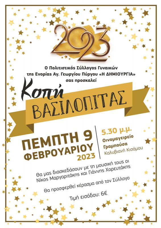 Ο Πολιτιστικός Σύλλογος Γυναικών της Ενορίας Αγίου Γεωργίου Πύργου «Η Δημιουργία», σας προσκαλεί στην κοπή της βασιλόπιτας την Πέμπτη 9 Φεβρουαρίου και ώρα 5.30 το απόγευμα, στο Οινομαγειρείο «Γραμπούσα», στην Καλυβιανή Κισάμου.