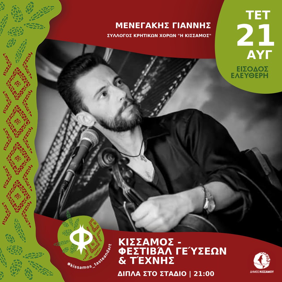 Στα πλαίσια του Φεστιβάλ “Γεύσεων & Τέχνης”, που πραγματοποιείται στην παραλία Γηπέδου Καστελλίου, σήμερα Τετάρτη 21 Αυγούστου στις 9 μ.μ. θα πραγματοποιηθεί Κρητική και λαϊκή βραδιά με τον Γιάννη Μενεγάκη.