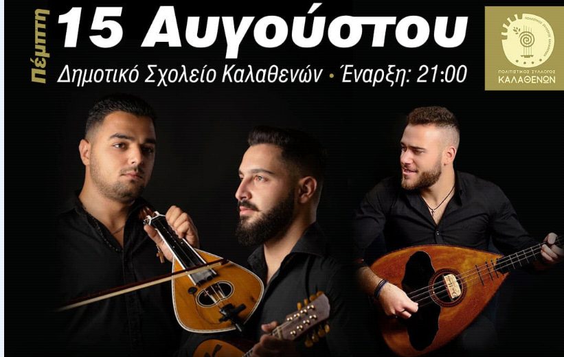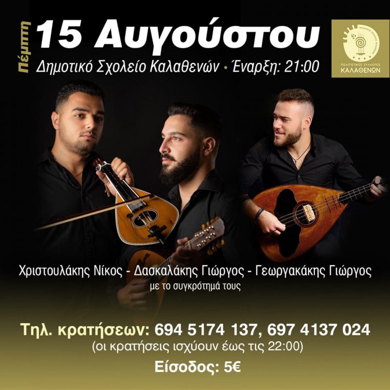 Ο Πολιτιστικός Σύλλογος Καλαθενών διοργανώνει κρητική βραδιά σήμερα Πέμπτη 15 Αυγούστου (9 μ.μ.) με τον Νίκο Χριστουλάκη και το συγκρότημά του, στο Δημοτικό Σχολείο Καλαθενών.