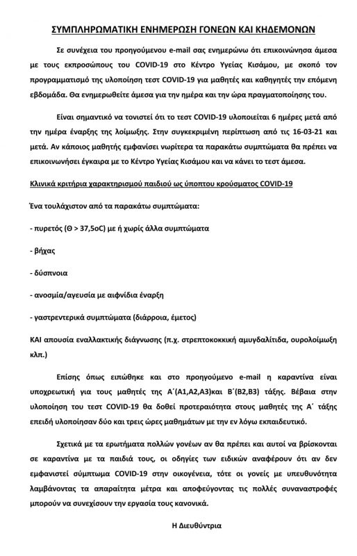 Για το λόγο αυτό καλούνται οι γονείς των μαθητών να στηρίξουν με κάθε τρόπο την εφαρμογή των μέτρων της υποχρεωτικής καραντίνας ώστε να συμβάλλουν, στην προσπάθεια περιορισμού της μετάδοσης του ίου.