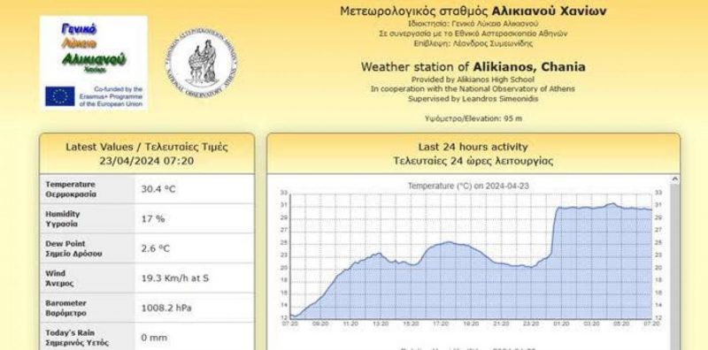 Στον Αλικιανό Χανίων η θερμοκρασία παρέμεινε συνεχώς πάνω από τους 31 βαθμούς σχεδόν όλη τη χρονική περίοδο από τα μεσάνυχτα ως το πρωί της Τρίτης 23/04.