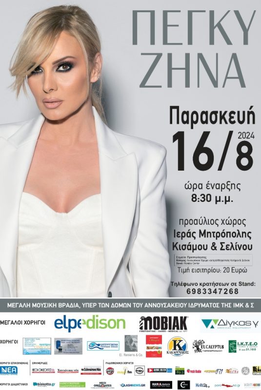 Το Αννουσάκειο Θεραπευτήριο της Ιεράς Μητροπόλεως μας, διοργανώνει μία μεγάλη μουσική βραδιά Κοινωνικής Αλληλεγγύης, με την Πέγκυ Ζήνα, μία από τις μεγαλύτερες λαϊκές φωνές της εποχής μας, την Παρασκευή 16 Αυγούστου, ώρα 20.30μ.μ., στον προαύλιο χώρο της Ιεράς Μητροπόλεως μας.