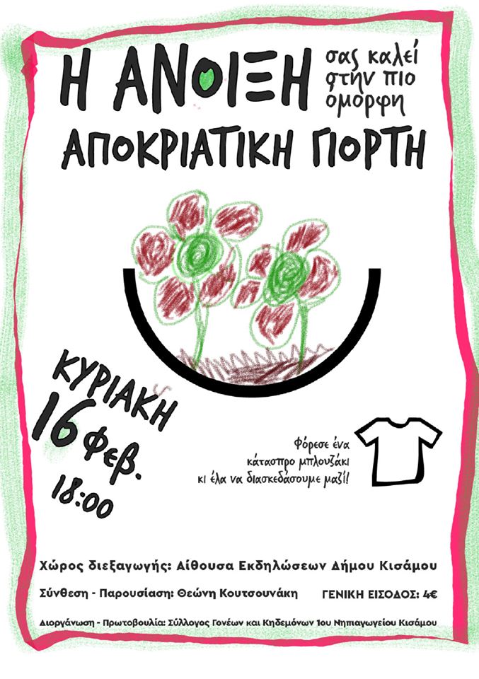 Ο Σύλλογος Γονέων & Κηδεμόνων του 1ου Νηπιαγωγείου Κισάμου σας προσκαλεί την Κυριακή 16 Φεβρουαρίου στις 6 μ.μ. σε μια πρωτότυπη Αποκριάτικη Γιορτή!