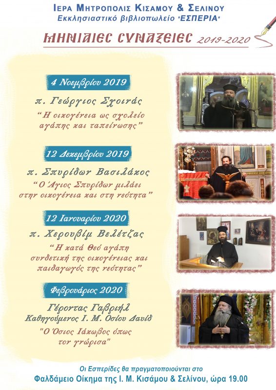 Η Ι. Μητρόπολις Κισάμου και Σελίνου στην προσπάθεια Της όπως συμβάλλει εις την στήριξη του θεσμού της οικογένειας ως το πρωτογενές κύτταρο της κοινωνίας αλλά και της ζωής, απευθύνεται σε Παιδιά, Γονείς και Εκπαιδευτικούς, ανακοινώνοντας την έναρξη μηνιαίων Συνάξεων, με προσκεκλημένους εκλεκτούς και καταξιωμένους ομιλητές, δόκιμους και ειδικούς επί θεμάτων που άπτονται της οικογένειας, της νεότητας, των ενδοοικογενειακών σχέσεων κ.α.