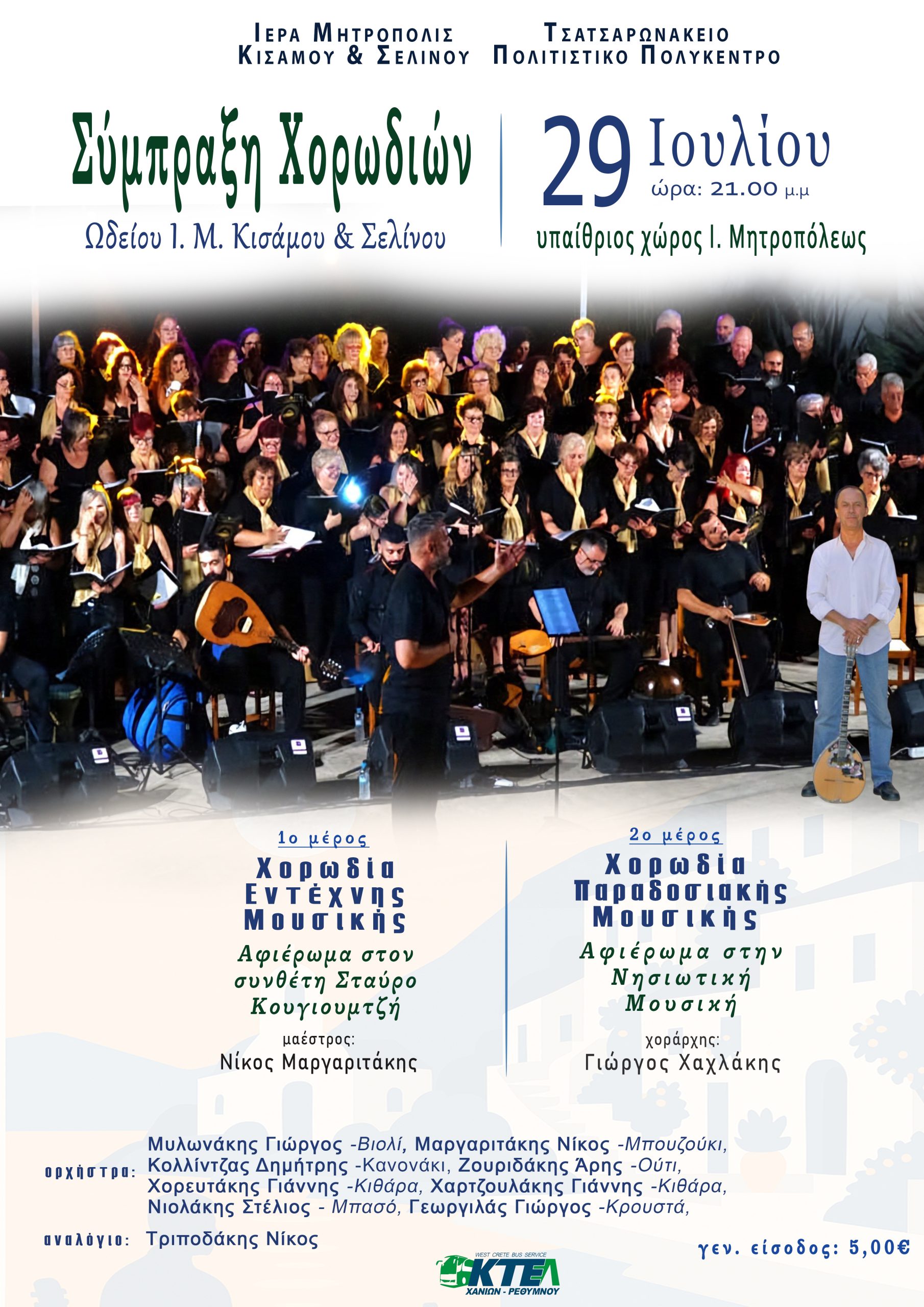 Τις πολυπληθείς Χορωδίες πλαισιώνουν οι μουσικοί: Νίκος Μαργαριτάκης-Μπουζούκι, Γιώργος Μυλωνάκης-Βιολί, Καλλίντζας Δημήτρης-Κανονάκι, Άρης Ζουριδάκης-Ούτι, Γιάννης Χορευτάκης-Κιθάρα, Γιάννης Χαρτζουλάκης-Κιθάρα, Στέλιος Νιολάκης-Μπάσο, Γιώργος Γεωργιλάς-Κρουστά, στο αναλόγιο ο Νίκος Τριποδάκης. Τρίτη, 29 Ιουλίου, ώρα 21.00 μ.μ., υπαίθριος αύλειος χώρος Ιεράς Μητροπόλεως, παραπλεύρως της πυροσβεστικής.