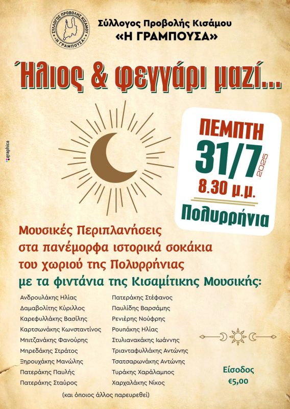 Ο Σύλλογος Προβολής Κισάμου «Η Γραμπούσα» διοργανώνει σήμερα Πέμπτη 31 Ιουλίου (8 μ.μ.) την εκδήλωση Μουσικές Περιπλανήσεις στην Πολυρρήνεια με τα «μουσικά φυντάνια» της Κισάμου (νέοι καλλιτέχνες)