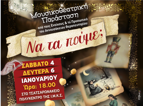 Το Αννουσάκειο Ίδρυμα, Κέντρο Α-Α ‘Ο Άγιος Σπυρίδων’ της Ιεράς Μητροπόλεως Κισάμου και Σελίνου, απευθύνει κάλεσμα χαράς και αγάπης όπως παρακολουθήσετε την Μουσικοθεατρική παράσταση των ενοίκων του Ιδρύματος, με τίτλο: “Να τα πούμε;”, το Σάββατο 4 & την Δευτέρα 06 Ιανουαρίου, ώρα 18.00 στο Τσατσαρωνάκειο Πολιτιστικό Πολύκεντρο της Ιεράς Μητροπόλεως μας. Σε αυτή την προσπάθεια, οι ένοικοι του Αννουσάκειου σας καλούν να βιώσετε διδακτικά μηνύματα, στο πνεύμα των Χριστουγέννων, που θα συγκινήσουν όλους μας.