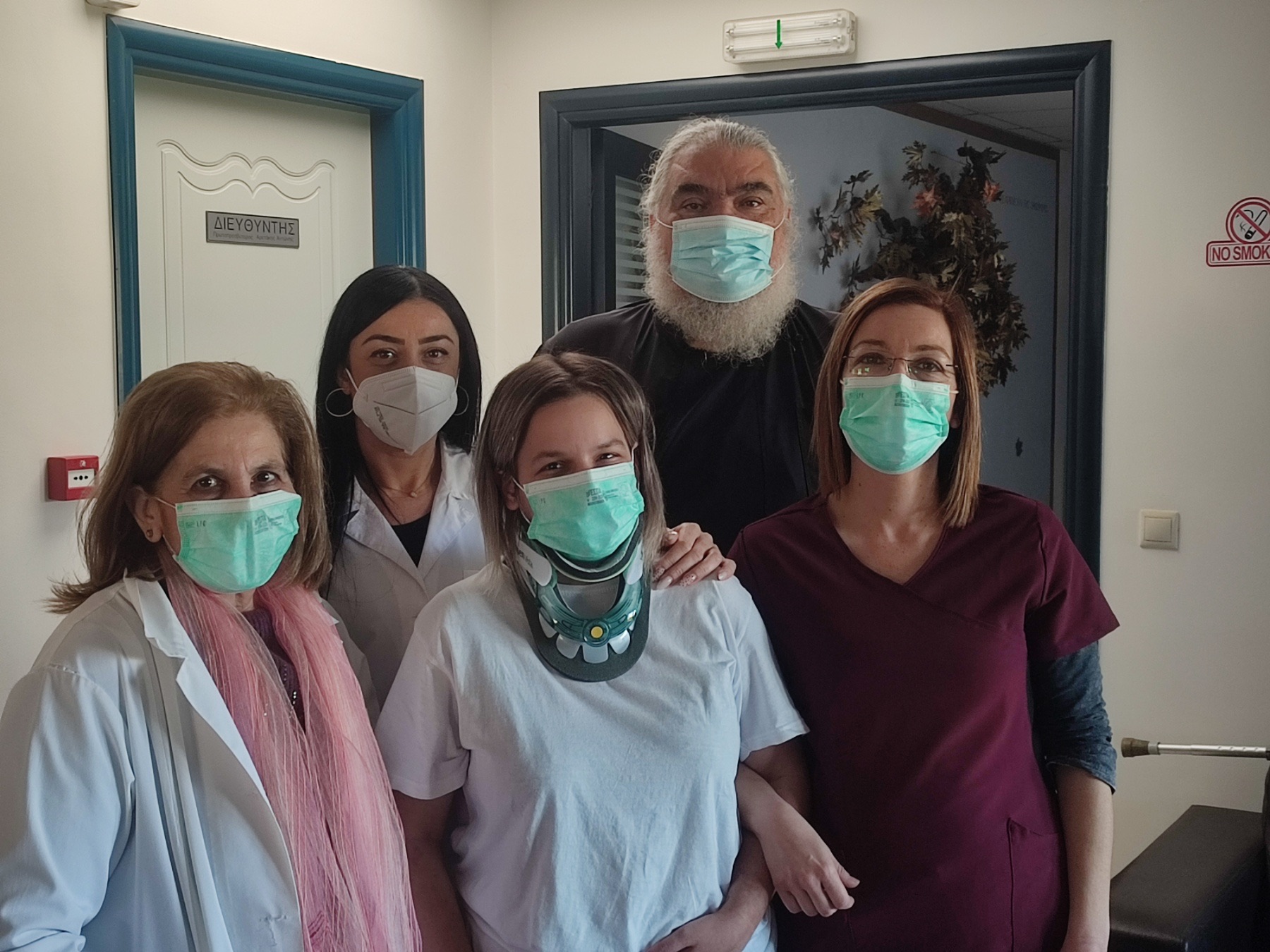 Στην φωτογραφία: η Κατερίνα με την Ιατρό Μαρία Ψαράκη (Ιατρό του Ιδρύματος), την Προϊσταμένη Αποθεραπείας του Ιδρύματος κα Αναστασία Ιγγλεζάκη, την Φυσικοθεραπεύτρια κα Μαρίνα Χαρζουλάκη και τον Διοικητικό Δντή του Ιδρύματος, Αιδ. Πρωτ. π. Αντώνιο Αρετάκη, ο οποίος έζησε εκ του σύνεγγυς το γεγονός, έχοντας ουσιαστική συμβολή.