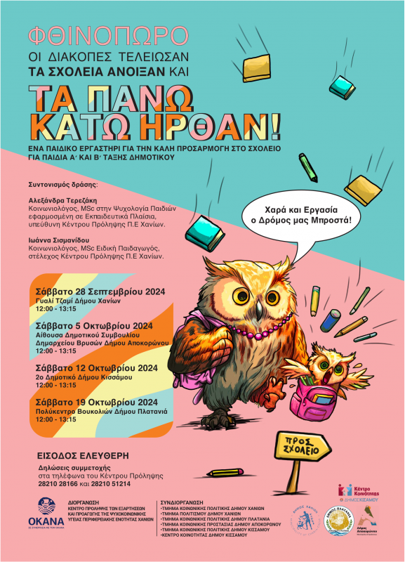 Ένα παιδικό εργαστήρι για την καλή προσαρμογή στο σχολείο για παιδιά Νηπιαγωγείου, Α & Β Δημοτικού. Το εργαστήρι θα πραγματοποιηθεί το Σάββατο 12 Οκτωβρίου, ώρα 12:00 – 13:15 στο 2ο Δημοτικό Σχολείο Κισάμου.