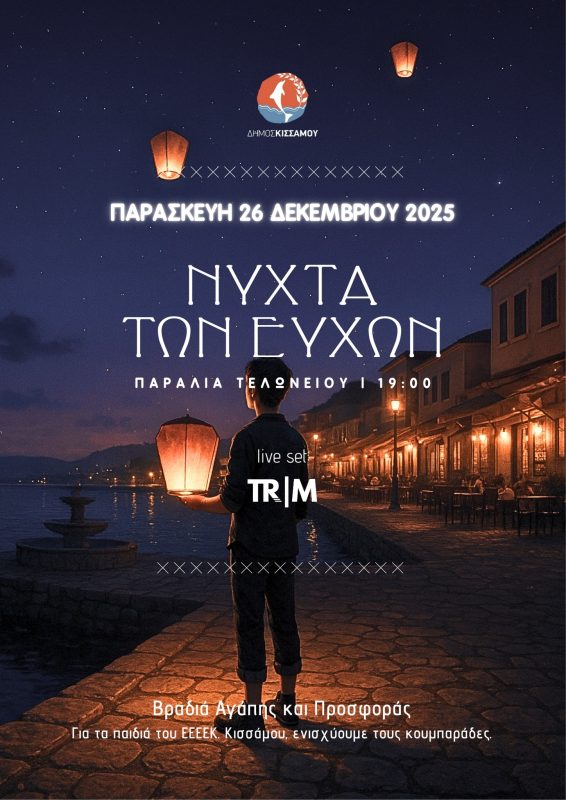 Την Παρασκευή 26 Δεκεμβρίου και ώρα 19:00, στην παραλία δίπλα από το Δημοτικό Στάδιο Κισάμου, θα πραγματοποιηθεί η «Νύχτα των Ευχών», ένα μοναδικό χριστουγεννιάτικο υπερθέαμα γεμάτο φως, συγκίνηση και προσφορά.