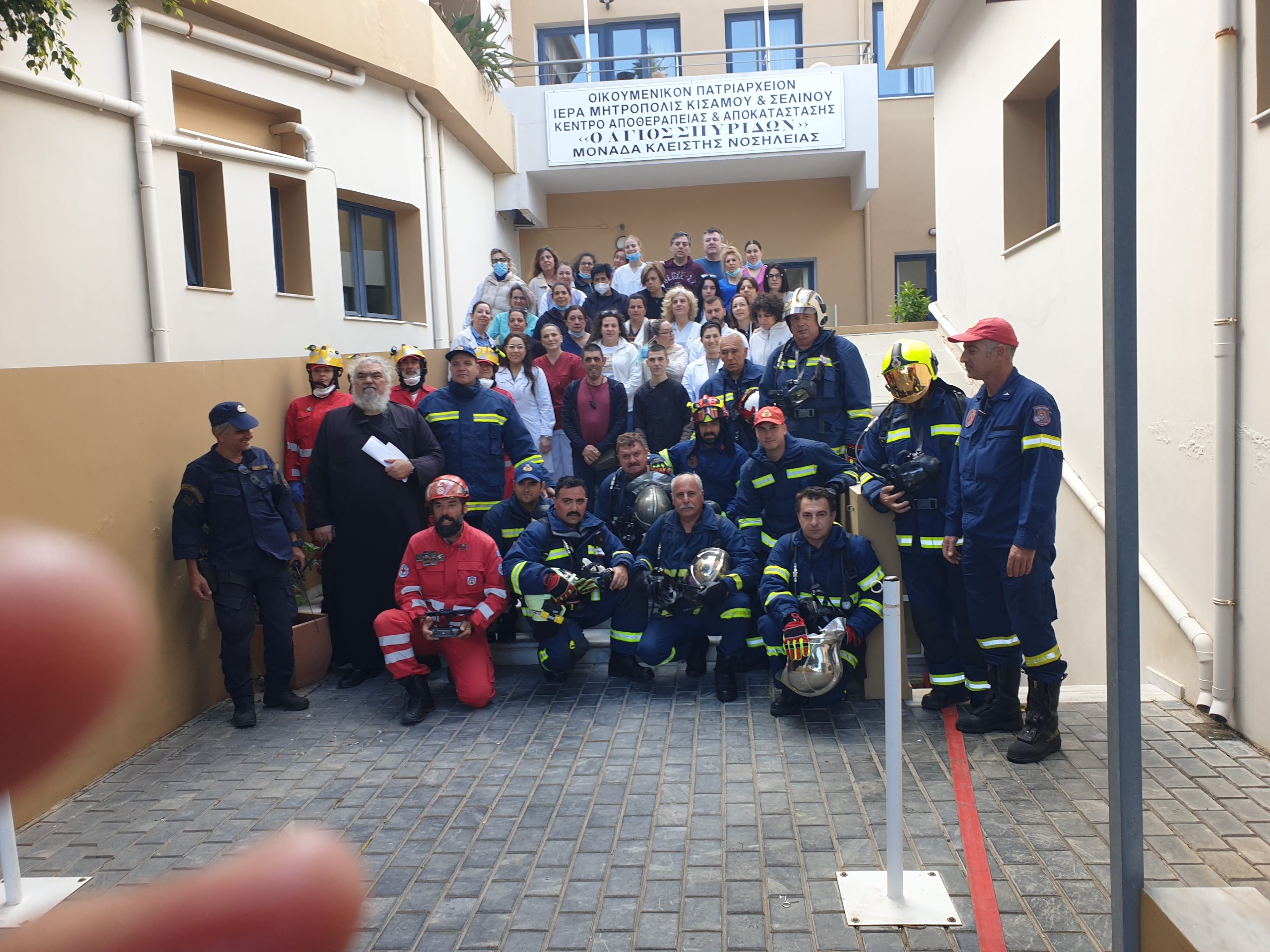 Πολύτιμη υπήρξε η συμβολή της Πυροσβεστικής Υπηρεσίας Κισάμου, όπου αφού εκπαίδευσε τους εργαζόμενους του Ιδρύματος, οργάνωσε την επιτέλεση της άσκησης, με συγκεκριμένο σενάριο. Οι στόχοι που τέθηκαν , επιτεύχθηκαν με αποτελεσματικότητα από το σύνολο των εμπλεκομένων φορέων και αφορούσαν: τρόπο αντιμετώπισης της πυρκαγιάς, εκκένωση του κτιρίου, παροχή πρώτων βοηθειών , μέσω της συνδρομής των εργαζομένων του Ιδρύματος, της Πυροσβεστικής Υπηρεσίας, της Αστυνομίας, του Ερυθρού Σταυρού και του Κέντρου Υγείας της τοπικής κοινότητας Κισάμου.