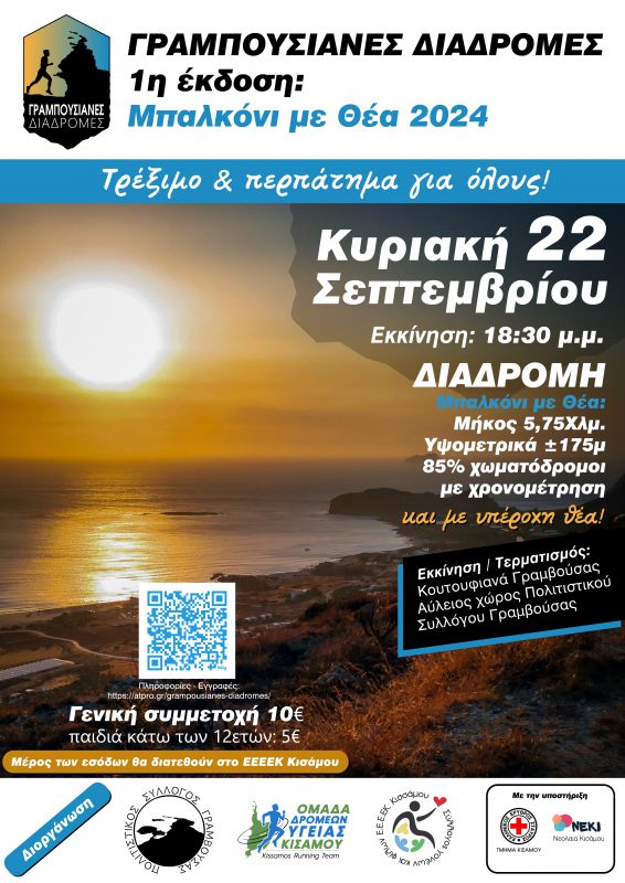 Ο Πολιτιστικός Σύλλογος Γραμβούσας σε συνεργασία με την Ομάδα Δρομέων Υγείας Κισάμου και τον Σύλλογο Γονέων Κηδεμόνων & Φίλων Μαθητών του ΕΕΕΕΚ Κισάμου διοργανώνουν για πρώτη φορά αγώνα τρεξίματος & δυναμικού βαδίσματος για όλους με την ονομασία «Γραμπουσιανές Διαδρομές».
