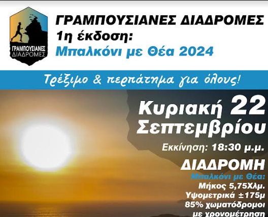 Στην πρώτη έκδοση της διοργάνωσης για το 2024 θα περιλαμβάνεται μια εύκολη διαδρομή μήκους 5,75Χλμ την οποία ονομάζουμε «Μπαλκόνι με Θέα» και η οποία θα έχει σημείο εκκίνησης τερματισμού τον αύλειο χώρο του Πολιτιστικού Συλλόγου Γραμβούσας στα Κουτουφιανά Γραμβούσας και θα διέρχεται κατά 85% από χωματόδρομους – αγροτικούς δρόμους. Χαρακτηριστικό της διαδρομής θα είναι η πανοραμική θέα (Εξ ου και το όνομα της διαδρομής) και η χαμηλή δυσκολία για trail διαδρομή δίνοντας έτσι την ευκαιρία σε όλους να συμμετάσχουν τρέχοντας ή περπατώντας, απολαμβάνοντας σε κάθε περίπτωση την μοναδική θέα της διαδρομής.