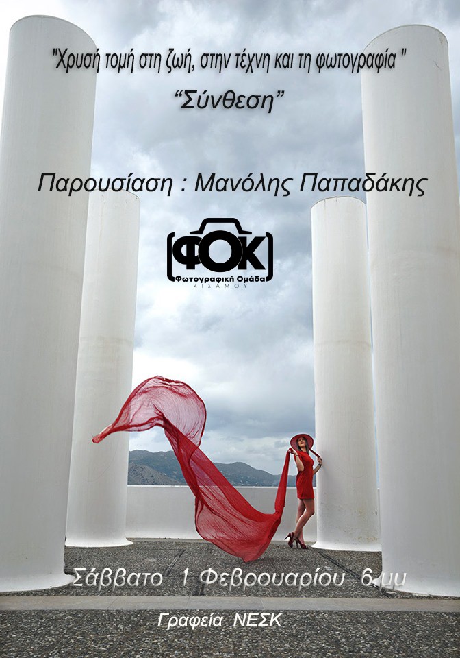 Η Φωτογραφική Ομάδα Κισάμου υποδέχεται από την ΕΦΕΚ ΗΡΑΚΛΕΙΟΥ τον καταξιωμένο και πολυβραβευμένο φωτογράφο Μανόλη Παπαδάκη. Σάββατο 1 Φεβρουάριου και ώρα 18:00, στα γραφεία του ΝΕΣΚ στην Κίσαμο, σε μια ξεχωριστή παρουσίαση όπου θα μας μιλήσει για τη χρυσή τομή στη ζωή, στην φύση, στη τέχνη και πως αυτή μπορεί να μας βοηθήσει για τη σύνθεση στη φωτογραφία, ενώ θα μας δείξει και μέρος της δουλειάς του.
