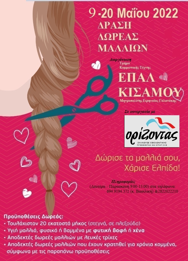 Το τμήμα Κομμωτικής Τέχνης του ΕΠΑΛ Κισάμου “Μητροπολίτης Ειρηναίος Γαλανάκης” (Αγαμέμνονος 24, Μαύρος Μόλος), σε συνεργασία με το σύλλογο εθελοντικής προσφοράς και στήριξης «ΟΡΙΖΟΝΤΑΣ», διοργανώνει για δεύτερη συνεχόμενη χρονιά εθελοντική δράση δωρεάς μαλλιών για τη δημιουργία περουκών, για παιδιά και ενήλικες που το έχουν ανάγκη κατά το στάδιο της χημειοθεραπείας.