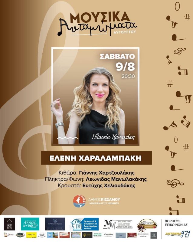 Σάββατο 9 Αυγούστου (9 μ.μ.). «Μουσικά Ανταμώματα 2025». Μουσική βραδιά στην πλατεία Τζανακάκη στο Καστέλλι με τους: Ελένη Χαραλαμπάκη (φωνή), Γιάννη Χαρτζουλάκη (κιθάρες), Λεωνίδα Μανωλακάκη (μπουζούκι – πλήκτρα), Ευτύχη Χελιουδάκη (κρουστά).