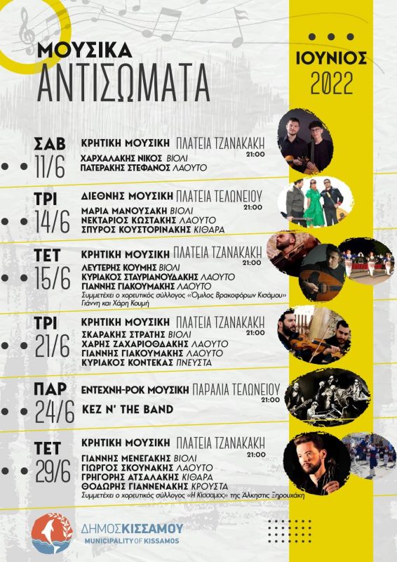 Ξεκινούν το ερχόμενο Σάββατο 11 Ιουνίου οι μουσικές εκδηλώσεις “Μουσικά Αντισώματα” που διοργανώνει για ολόκληρο τον μήνα ο Δήμος Κισάμου στις πλατείες Τζανακάκη και Τελωνείου.