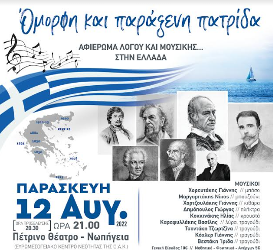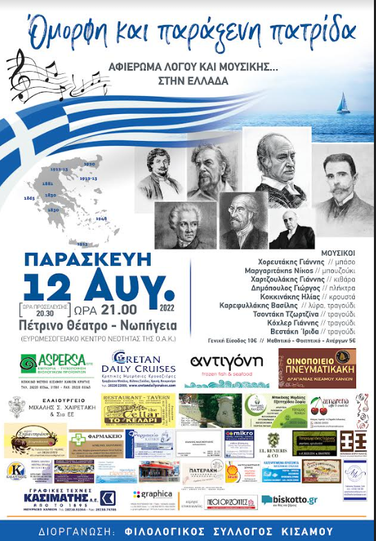 Με αφορμή τη συμπλήρωση πέρυσι των 200 χρόνων από την Επανάσταση του 1821 και των 100 χρόνων φέτος από τη Μικρασιατική Καταστροφή, ο Φιλολογικός Σύλλογος Κισάμου “Κισαμικός” διοργανώνει εκδήλωση λόγου και μουσικής με τίτλο “Όμορφη και παράξενη πατρίδα”, την Παρασκευή 12 Αυγούστου, στο Πέτρινο θέατρο στα Νοπήγεια. Ώρα προσέλευσης: 8.30 μ.μ.