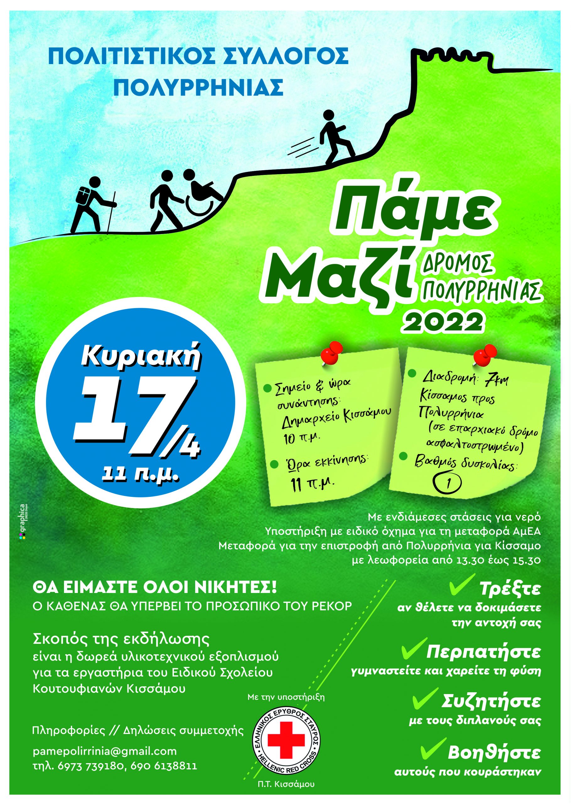 Ο Πολιτιστικός Σύλλογος Πολυρρηνίας «Η Πολυρρήνια», διοργανώνει στις 17/4/2022 την εκδήλωση ΠΑΜΕ ΜΑΖΙ!-Δρόμος Πολυρρήνιας.