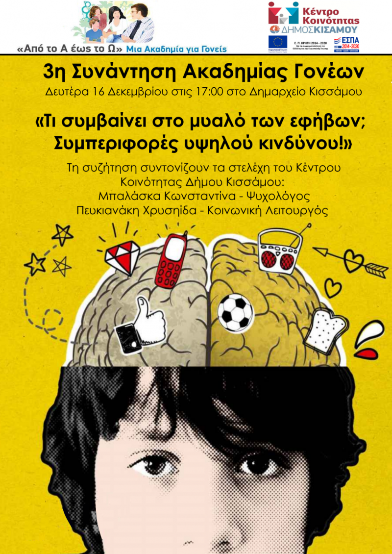 Τη Δευτέρα 16 Δεκεμβρίου στις 17.00 η ώρα στην αίθουσα του Δημαρχείου Κισάμου θα πραγματοποιηθεί η 3η συνάντηση της Ακαδημίας Γονέων με θέμα συζήτησης «Τι συμβαίνει στο μυαλό των εφήβων; Συμπεριφορές υψηλού κινδύνου»