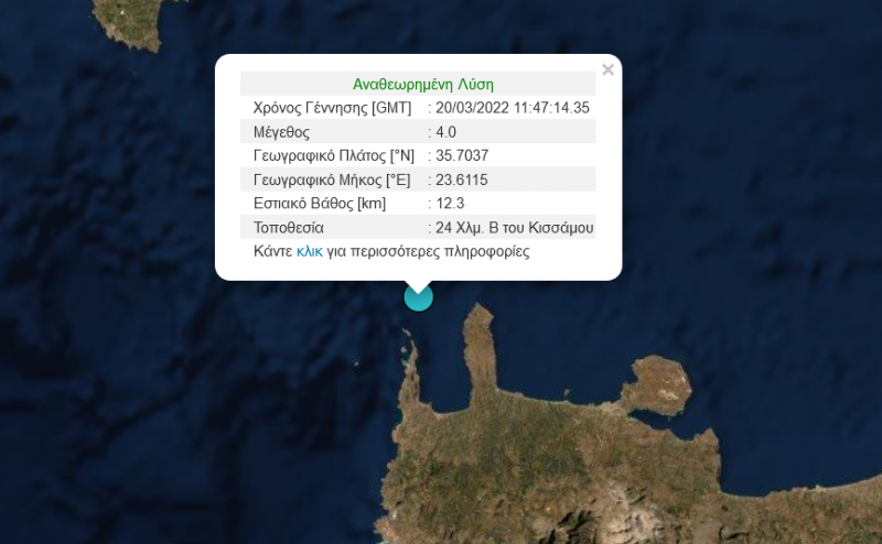 Σύμφωνα με την αυτόματη μέτρηση του Γεωδυναμικού Ινστιτούτου ο σεισμός είχε μέγεθος 4 Ρίχτερ. Το επίκεντρο εντοπίζεται 24 χιλιόμετρα βόρεια της Κισάμου.