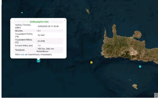 Σεισμός 4,1 βαθμών της κλίμακας Ρίχτερ σημειώθηκε τα ξημερώματα δυτικά της Κρήτης.