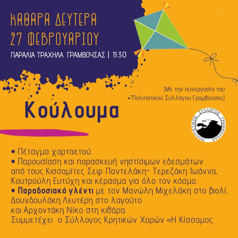 Η εκδήλωση περιλαμβάνει πέταγμα χαρταετού, παρουσίαση και παρασκευή νηστίσιμων εδεσμάτων από τους Κισαμίτες Σεφ: Ιωάννα Παντελάκη- Τερεζάκη και Ευτύχη Κουτρούλη, κέρασμα για όλο τον κόσμο και παραδοσιακό γλέντι με τον Μανώλη Μιχελάκη στο βιολί, Λευτέρη Δουνδουλάκη στο λαγούτο και Νίκο Αρχοντάκη στην κιθάρα.