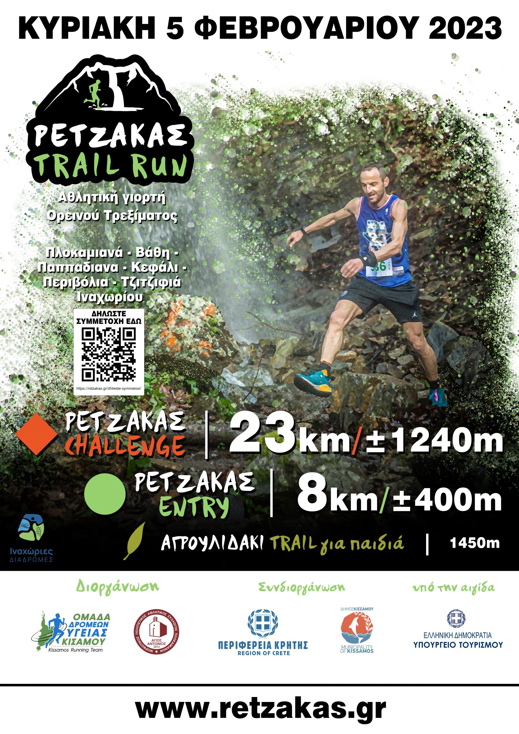 O Δήμος Κισάμου, η Περιφερειακή Ενότητα Χανίων ,o Μορφωτικός Πολιτιστικός Αθλητικός Σύλλογος Πλοκαμιανών Κισάμου και η Ομάδα Δρομέων Υγείας Κισάμου, διοργανώνουν γιορτή ορεινού τρεξίματος με την ονομασία “Ρέτζακας Trail Run” και θα λάβει χώρα την Κυριακή 5 Φεβρουαρίου 2023 και ώρα 10:00 , στην ημιορεινή περιοχή Πλοκαμιανών, Βάθης, Παπαδιανών, Κεφαλίου, Περιβολίων, Τζιτζιφιάς (Δ.Δ. Ιναχωρίου, Δήμου Κισάμου, 10 χλμ. πριν το Λαφονήσι)