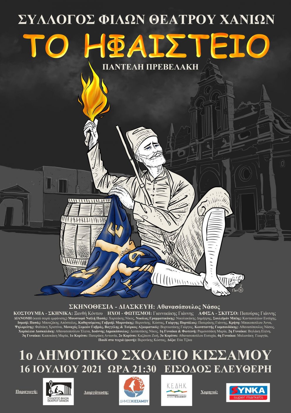 Με αφορμή την συμπλήρωση των 200 χρόνων από την επανάσταση του 1821, ο Δήμος Κισάμου και η Κοινωφελής Επιχείρηση του Δήμου Κισάμου, παρουσιάζουν το βραβευμένο με κρατικό βραβείο θεάτρου έργο του Παντελή Πρεβελάκη «Το Ηφαίστειο». Το έργο αναφέρεται στην εθελοθυσία του Αρκαδίου και αφιερώθηκε από τον συγγραφέα στην μνήμη του θείου του Γεωργίου Αλεβίζου Πρεβελάκη που σκοτώθηκε στο Αρκάδι στις 9 Νοεμβρίου 1866.