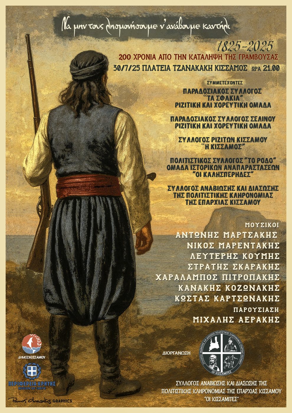 Ο Σύλλογος Αναβίωσης και Διάσωσης της πολιτιστικής κληρονομιάς της Επαρχίας Κισάμου «Οι Κισαμίτες», διοργανώνει τιμητική τραγουδιστική και μουσικοχορευτική εκδήλωση σήμερα Τετάρτη 30 Ιουλίου στις 21.00στην πλατεία Τζανακάκη στο Καστέλλι Κισάμου, για να τιμήσει τη 200η επέτειο από την κατάληψη της Γραμπούσας, το 1825.