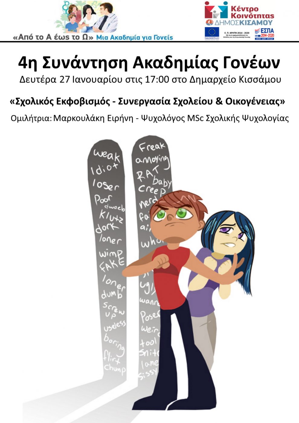 Τη Δευτέρα 27 Ιανουαρίου στις 17.00 η ώρα στην αίθουσα του Δημαρχείου Κισάμου θα πραγματοποιηθεί η 4η συνάντηση της Ακαδημίας Γονέων με θέμα συζήτησης «Σχολικός Εκφοβισμός: Συνεργασία σχολείου και οικογένειας»