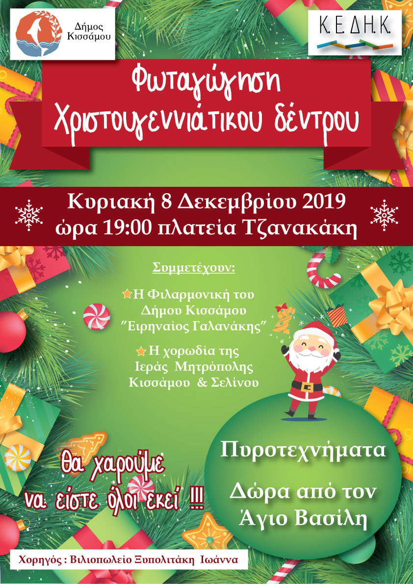 Ο Δήμος Κισάμου και η Κοινωφελής Επιχείρηση Δήμου Κισάμου σας προσκαλεί στη φωταγώγηση του χριστουγεννιάτικου δέντρου την Κυριακή 8 Δεκεμβρίου και ώρα 7 μ.μ. στην πλατεία Τζανακάκη στο Καστέλλι.