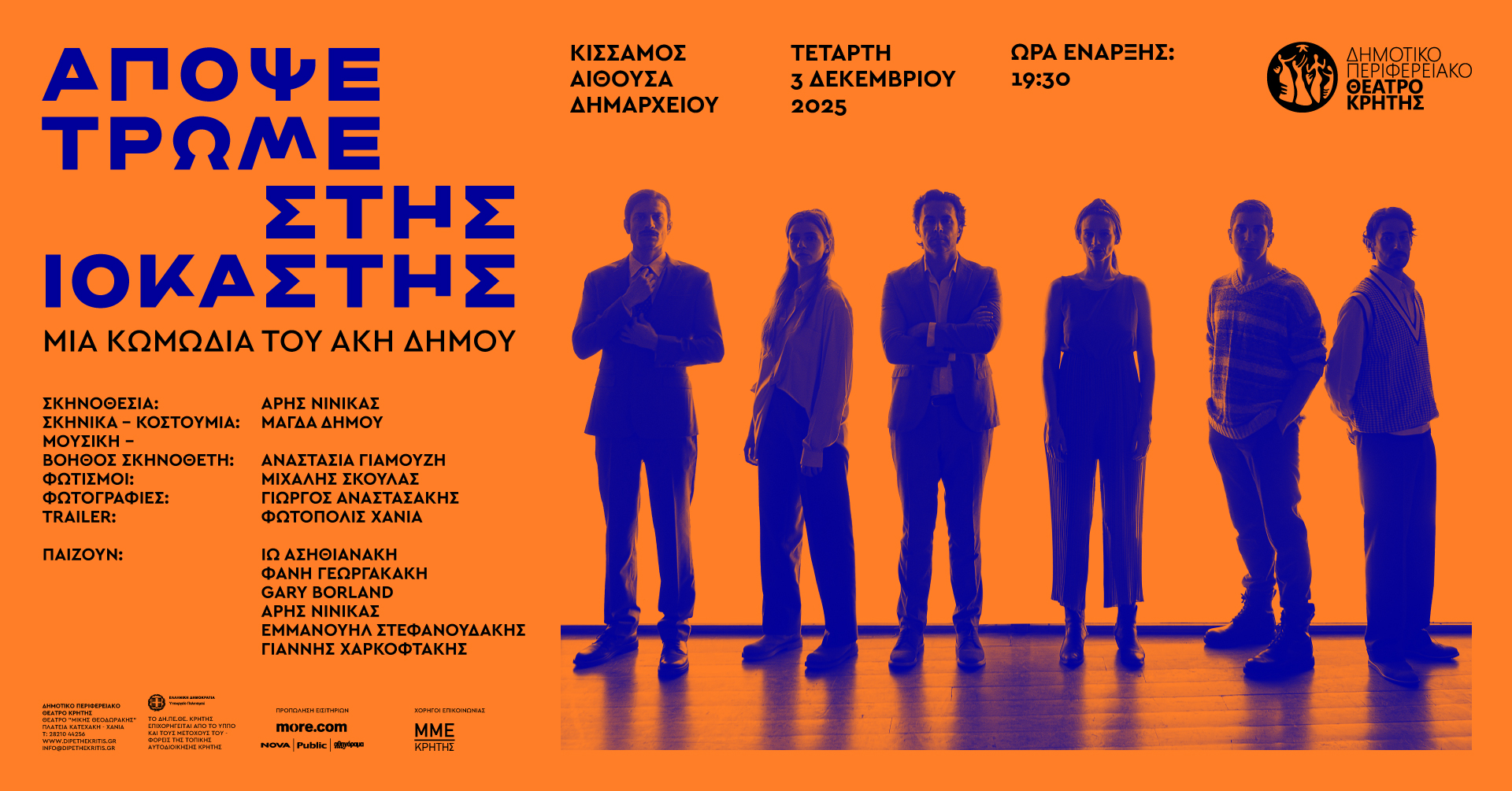 Το Δημοτικό Περιφερειακό Θέατρο Κρήτης παρουσιάζει την εκρηκτική κωμωδία του Άκη Δήμου «Απόψε τρώμε στης Ιοκάστης» σε σκηνοθεσία Άρη Νινίκα. Πρόκειται για ένα από τα κορυφαία έργα της σύγχρονης ελληνικής δραματουργίας.