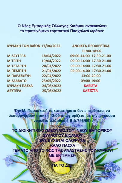 Ο Νέος Εμπορικός Σύλλογος Κισάμου ανακοινώνει το προτεινόμενο εορταστικό Πασχαλινό ωράριο: