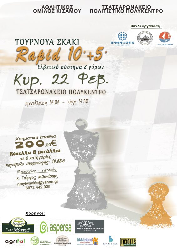 Ο Αθλητικός Όμιλος Κισάμου, σε συνεργασία με το Tσατσαρωνάκειο Πολιτιστικό Πολύκεντρο και την υποστήριξη της Ιεράς Μητροπόλεως Κισάμου & Σελίνου, της Περιφέρειας Κρήτης και του Δήμου Κισάμου προκηρύσσουν την διεξαγωγή τουρνουά RAPID Σκάκι, την Κυριακή 22 Φεβρουαρίου.