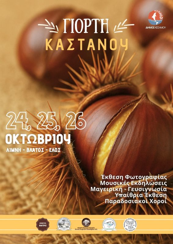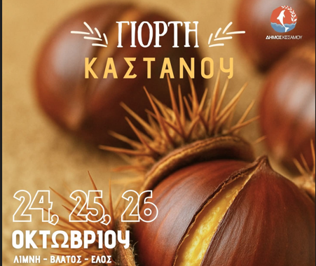 Το τριήμερο 24-26 Οκτωβρίου θα πραγματοποιηθεί στη Δημοτική Ενότητα Ιναχωρίου του Δήμου Κισάμου η καθιερωμένη Γιορτή Καστάνου, μια γιορτή που αποτελεί πλέον θεσμό για τα πολιτιστικά δρώμενα της Κισάμου, χάρη στον εθελοντισμό και το μεράκι των κατοίκων