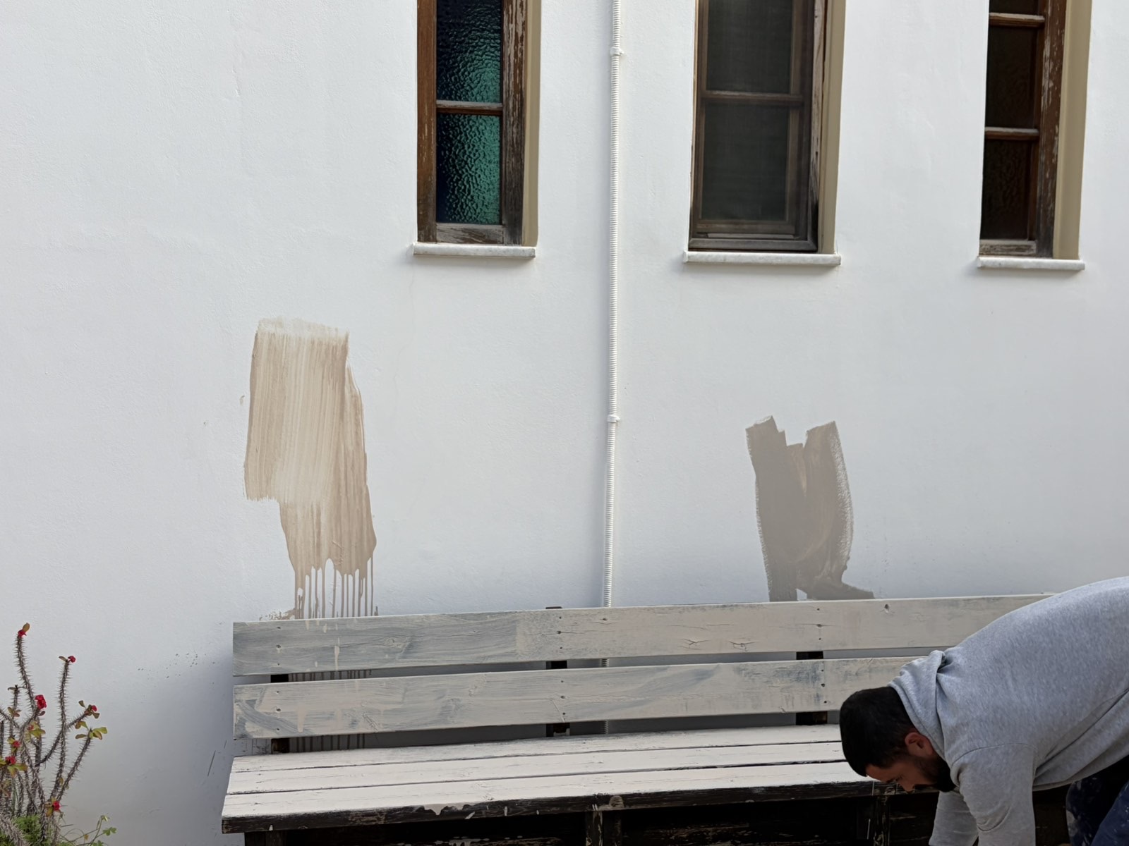 Έβαψαν τοίχο του Ι. Ναού του Αγίου Οικουμενίου, πασάλειψαν 2 παγκάκια της αυλής, ένα κάδο απορριμμάτων, ως επίσης και διακοσμητικά τούβλα στην αυλή του Αγίου Οικουμενίου.