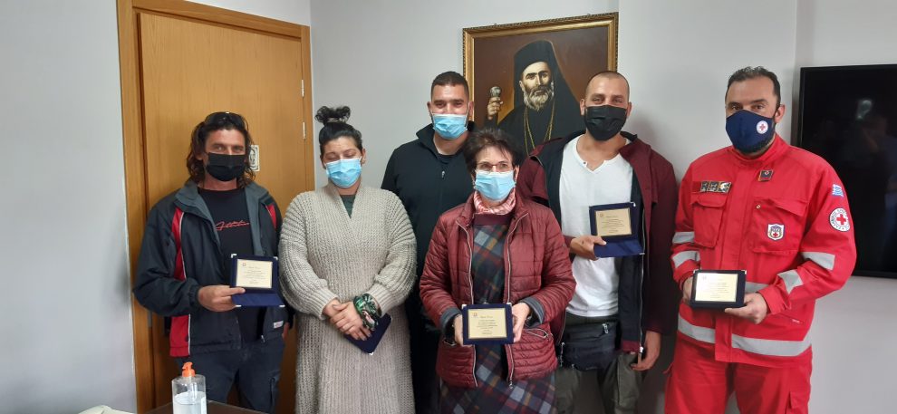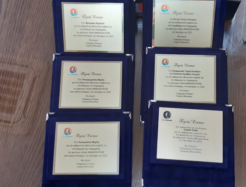 Συγκεκριμένα, απονεμήθηκαν τιμητικές πλακέτες στους εθελοντές ναυαγοσώστες Δημήτρη Βρουχάκη, Μιχάλη Πατερομιχελάκη και Μιχάλη Σγουρομάλλη που με αυταπάρνηση βοήθησαν στην διάσωση των ναυαγών αψηφώντας τις δυσμενέστατες καιρικές συνθήκες, στο Περιφερειακό Τμήμα Κισάμου του Ελληνικού Ερυθρού Σταυρού που βρέθηκε στο σημείο του ναυαγίου από την πρώτη στιγμή, στους γιατρούς και νοσηλευτές του Κέντρου Υγείας Κισάμου που φρόντισαν για την περίθαλψη των ναυαγών, αλλά και στο προσωπικό του ξενοδοχείου Castell Hotel στο οποίο φιλοξενήθηκαν οι ναυαγοί μετά την περιπέτειά τους.