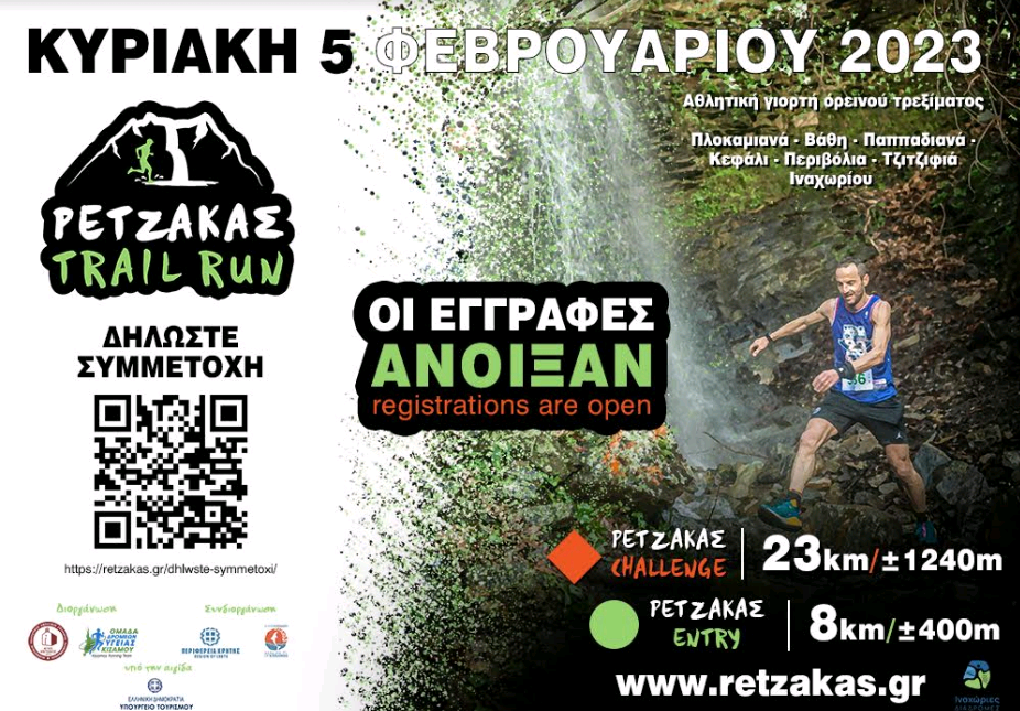 Οι εγγραφές για το Ρετζακας Trail Run 2023 άνοιξαν. Στην επίσημη ιστοσελίδα www.retzakas.gr μπορείτε να βρείτε αναλυτικές πληροφορίες για τις διαδρομές, κανονισμό αγώνα, την διοργάνωση γενικά, πρόσβαση, χορηγίες, κλπ.