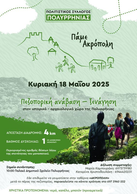 Ο Πολιτιστικός Σύλλογος Πολυρρήνειας διοργανώνει την Κυριακή 18 Μαΐου Πεζοπορία – Ξενάγηση στον αρχαιολογικό χώρο της Πολυρρήνειας.