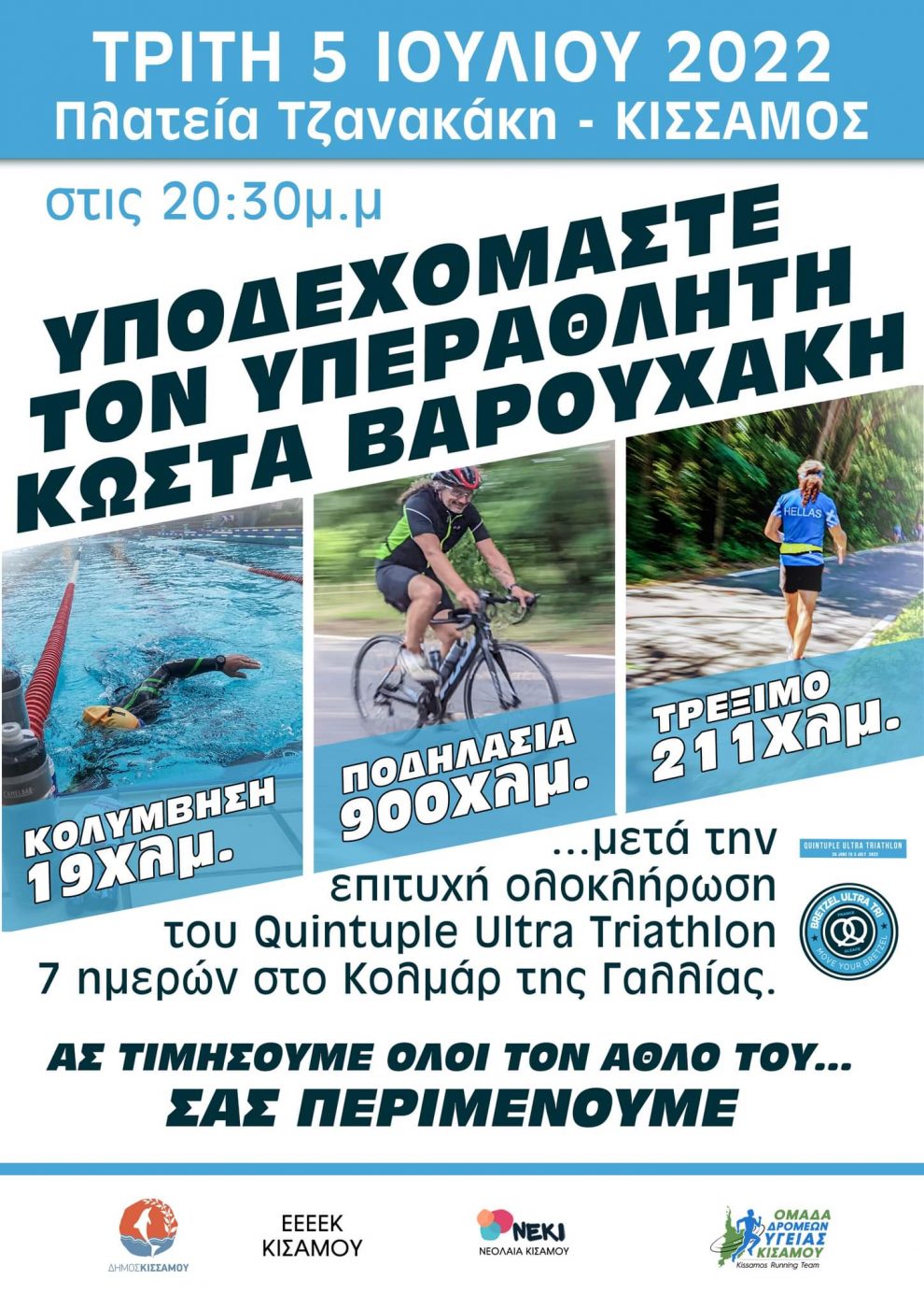 Σας προσκαλούμε στην υποδοχή του υπεραθλητή μας Κώστα Βαρουχάκη, μετά την επιτυχή ολολκλήρωση του QUINTUPLE ULTRA TRIATHLON στο Καλμάρ της Γαλλίας που περιλάμβανε 19 χλμ. κολύμβηση, 900 χλμ. ποδηλασία και 211 χλμ. τρέξιμο, σε υπερπροσπάθεια, σε έναν αγώνα 7 ημερών.