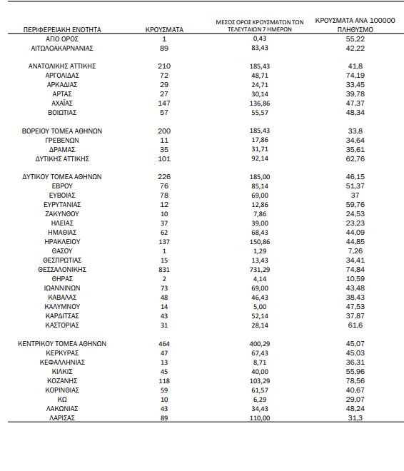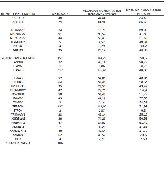Ο συνολικός αριθμός των κρουσμάτων ανέρχεται σε 994.901 (ημερήσια μεταβολή +0.5%), εκ των οποίων 50.5% άνδρες. Με βάση τα επιβεβαιωμένα κρούσματα των τελευταίων 7 ημερών, 95 θεωρούνται σχετιζόμενα με ταξίδι από το εξωτερικό και 2.848 είναι σχετιζόμενα με ήδη γνωστό κρούσμα
