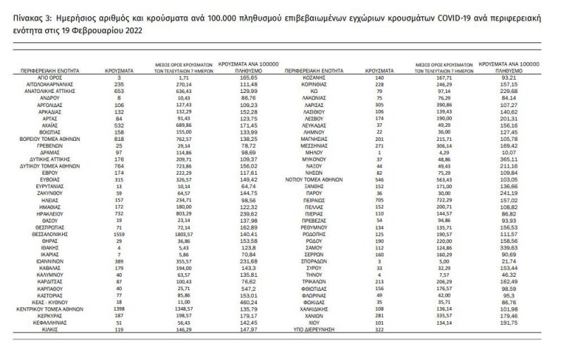 Τα νέα εργαστηριακά επιβεβαιωμένα κρούσματα της νόσου που καταγράφηκαν τις τελευταίες 24 ώρες είναι 15.305 , εκ των οποίων 33 εντοπίστηκαν κατόπιν ελέγχων στις πύλες εισόδου της χώρας. Ο συνολικός αριθμός των κρουσμάτων ανέρχεται σε 2.289.330 (ημερήσια μεταβολή +0.7%), εκ των οποίων 49.6% άνδρες. Με βάση τα επιβεβαιωμένα κρούσματα των τελευταίων 7 ημερών, 313 θεωρούνται σχετιζόμενα με ταξίδι από το εξωτερικό και 2.232 είναι σχετιζόμενα με ήδη γνωστό κρούσμα.