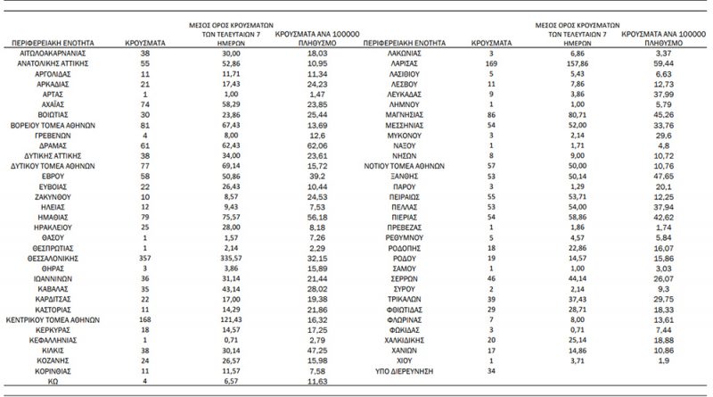 Τα νέα εργαστηριακά επιβεβαιωμένα κρούσματα της νόσου που καταγράφηκαν τις τελευταίες 24 ώρες είναι 2.313, εκ των οποίων 14 εντοπίστηκαν κατόπιν ελέγχων στις πύλες εισόδου της χώρας. Ο συνολικός αριθμός των κρουσμάτων ανέρχεται σε 692.197 (ημερήσια μεταβολή +0.3%), εκ των οποίων 50.8% άνδρες. Με βάση τα επιβεβαιωμένα κρούσματα των τελευταίων 7 ημερών, 116 θεωρούνται σχετιζόμενα με ταξίδι από το εξωτερικό και 2.171 είναι σχετιζόμενα με ήδη γνωστό κρούσμα.