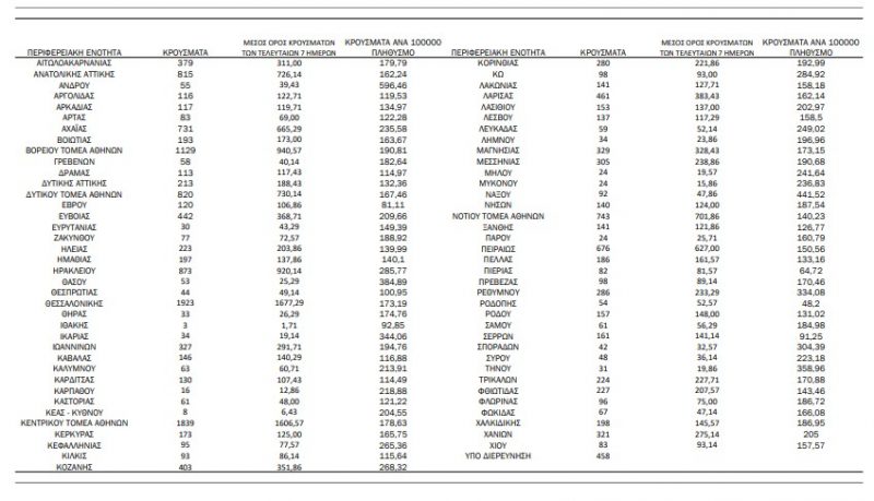 Ο συνολικός αριθμός των κρουσμάτων ανέρχεται σε 2.623.628 (ημερήσια μεταβολή +0.7%), εκ των οποίων 49.3% άνδρες. Με βάση τα επιβεβαιωμένα κρούσματα των τελευταίων 7 ημερών, 214 θεωρούνται σχετιζόμενα με ταξίδι από το εξωτερικό και 1.305 είναι σχετιζόμενα με ήδη γνωστό κρούσμα.